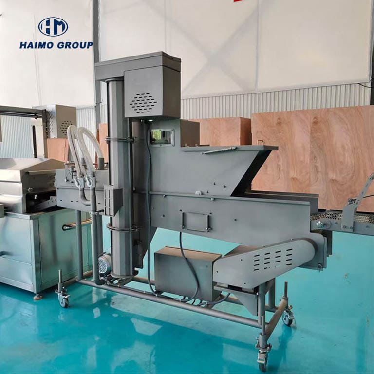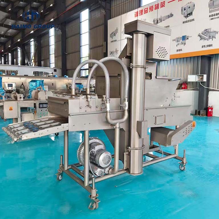 The HMSK series bread crumb applicator is designed for high-efficiency, uniform coating of a wide range of products, including chicken, beef, other meats, and seafood. It applies a top layer of crumbs from the hopper and a bottom layer while products pass through the conveyor belt, ensuring full coverage with minimal waste.