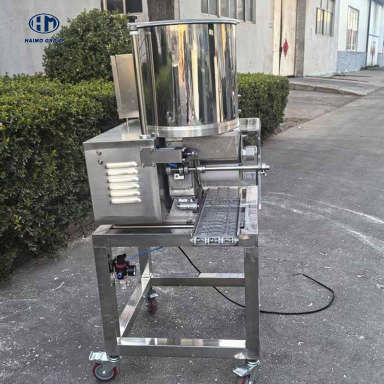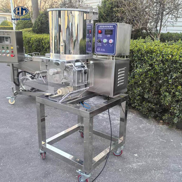 The HM-FMP1/2/3 Small Patty Forming Machine is a compact, high-performance solution for producing uniform patties from meat, seafood, vegetables, and cheese. It is the core unit of a small hamburger processing line that can complete forming, battering, flouring, and bread crumbing in sequence.