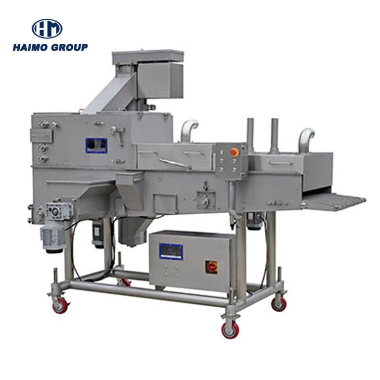A: A flouring machine (preduster) applies a thin, uniform layer of flour or starch to products before battering. This base layer improves batter adhesion and prevents coating from falling off during frying.