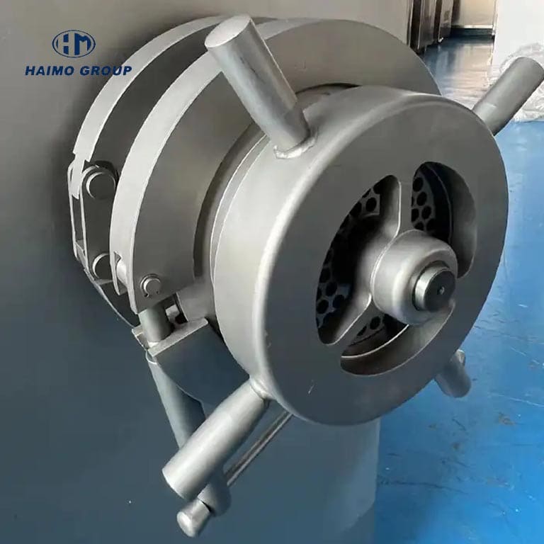 The powerful motor drives a large-pitch auger, which continuously feeds meat through the precision-cast cage and toward the cutting assembly. The meat is then forced through the selected hole plate and sliced cleanly by the rotating blades, producing uniform meat granules with minimal smearing or temperature rise.