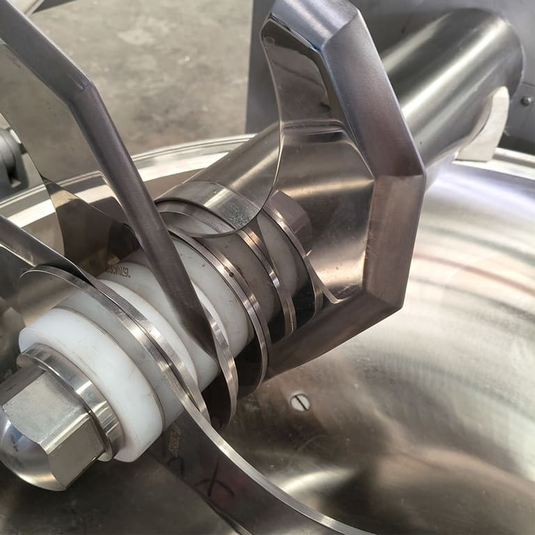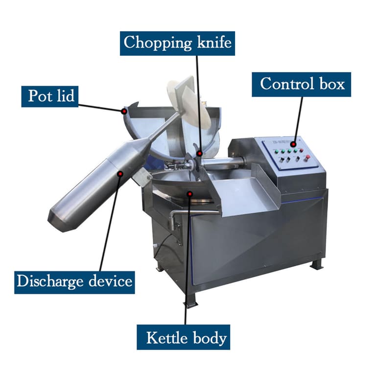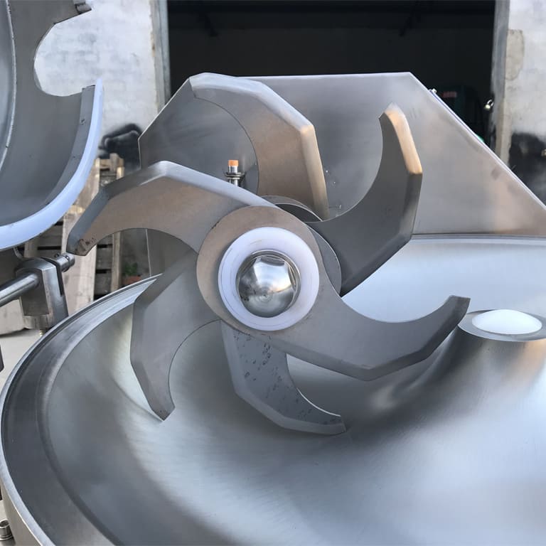 The high-speed rotating chopping knives work in perfect synchronization with the rotating cutting pot to transform raw meat blocks into a delicate, fine minced texture. Simultaneously, the mixing action ensures even distribution of auxiliary materials, additives, and seasonings throughout the meat mass.